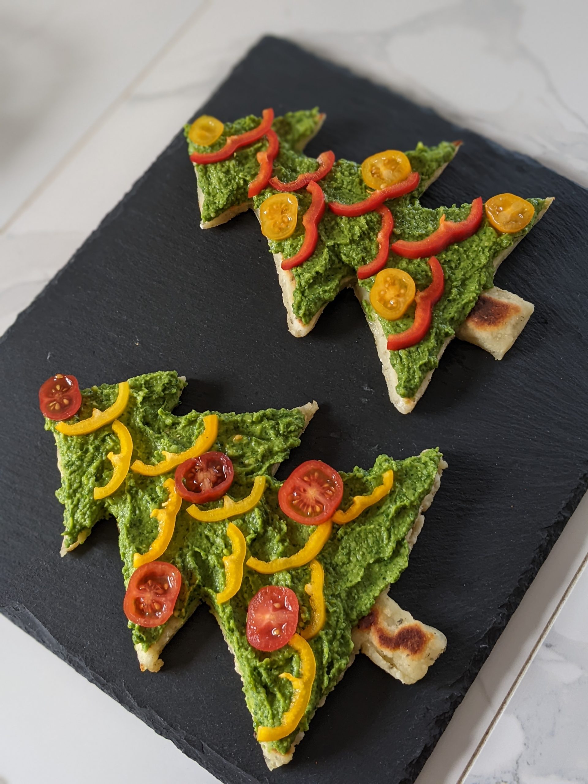 - Once flatbread is cooked and cooled, spread green dip to resemble a Christmas tree. Invite your child to decorate their tree with different vegetables and toppings of choice